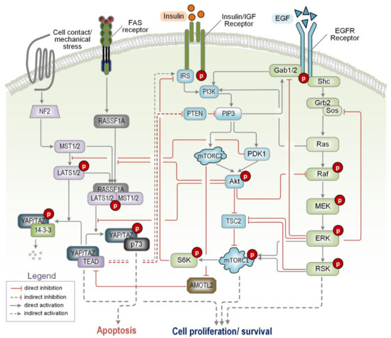 It has been shown that MST1 is capable of forming a complex with and suppressing the activity of Akt, therefore negatively regulating PI3K/mTOR signalling [140]. On the other hand, YAP activity is known to suppress PTEN translation via the microRNA miR-29 [141]. The inhibition of PTEN, a negative regulator of PI3K/mTOR signalling, thus promotes PI3K/mTOR signalling and enhances cell growth. In addition, YAP/TAZ positively regulates IRS2 expression in human hepatocellular carcinoma [142]. Collectively, these discoveries demonstrate a strong interplay between the PI3K/mTOR and Hippo/YAP pathways (see Figure 3) and help explain why YAP hyper-activation is observed in some cancers [143]. The major trend of the connections between these pathways is that of positive feedback loops promoting mutual activation, and their partnership has strong implications for oncogenic progression.