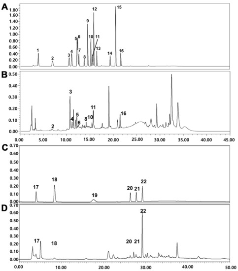 HPLC chromatograms of (B) polyphenolic compounds and (D) parishin derivatives of the 70% aqueous ethanol extract of MT. Mixtures of authentic standards for (A) polyphenolic compounds and (C) parishin derivatives: 1. gallic acid, 2. protocatechuic acid, 3. p-hydroxybenzoic acid, 4. chlorogenic acid, 5. caffeic acid, 6. syringic acid, 7. isovanillic acid, 8. rutin, 9. p-coumaric acid, 10. ferulic acid, 11. taxifolin, 12. trans-coumaric acid, 13. rosmarinic acid, 14. quercetin, 15. trans-cinnamic acid, 16. kaempferol, 17. gastrodin, 18. p-hydroxybenzyl alcohol, 19. parishin E, 20. parishin B, 21. parishin C, 22. parishin A.