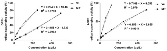 DPPH and ABTS assays are convenient and popular to apply the radical scavenging properties of compounds. The radical scavenging properties of MT fruit extract were evaluated as described previously [61].