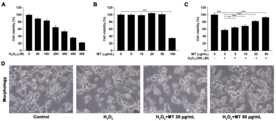 Protective effects of MT against H2O2-induced cell damage in SH-SY5Y cells. (A) SH-SY5Y cells were treated with various concentrations of H2O2 for 24 h, and LC50 (50% lethal concentration) was determined by MTT assay. (B) SH-SY5Y cells were treated with different concentrations of MT to assess cytotoxicity. (C) SH-SY5Y cells were pretreated with different concentrations of MT for 2 h before H2O2 treatment, and cell viability was measured. (D) Morphological changes (400×) were observed under an inverted microscope. Data are presented as mean ± SEM of three independent experiments. * p < 0.05, and *** p < 0.001.