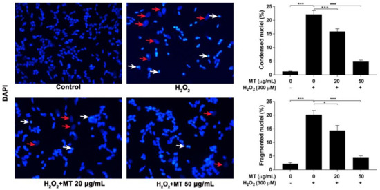 Effect of MT on H2O2-induced apoptosis in SH-SY5Y cells. Cells were pretreated with MT for 2 h following exposure to H2O2, percentages of condensed nuclei (white arrows) and fragmented nuclei (red arrows) were detected by DAPI staining (400×). Data are presented as mean ± SEM of three independent experiments. * p < 0.05, and *** p < 0.001.