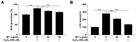 ROS levels are indicators of oxidative stress, and excess ROS generation triggers cell apoptosis. LDH release level in media was measured as an index of cytotoxicity after exposure to H2O2. Compared with untreated control cells, cells challenged with H2O2 showed a markedly (p < 0.001) increased in ROS generation and LDH leakage, indicating that H2O2 treatment resulted in oxidative stress and cytotoxicity. However, pretreatment with MT significantly (p < 0.05, or p < 0.001) blocked the H2O2-challenged accumulation of ROS and release of LDH (Figure 5A,B). These results demonstrated that MT exerted protective effects on cells exposed to H2O2 by reducing oxidative stress and alleviating cytotoxicity.
