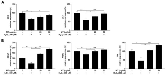 Effects of MT on the expression of genes encoding antioxidant enzymes and neuronal markers in SH-SY5Y neuroblastoma cells. Expression of genes encoding the antioxidant enzymes (A) SOD and CAT and the neuronal markers (B) BDNF, AADC, and TH were evaluated by real-time PCR. Data are presented as mean ± SEM of three independent experiments. * p < 0.05, ** p < 0.01, and *** p < 0.001.