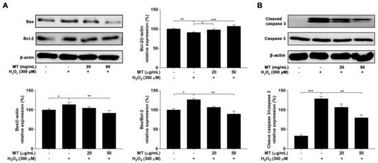To further explore the mechanism of H2O2-challenged apoptosis, the expression of anti-apoptotic Bcl-2 and pro-apoptotic Bax was measured. Cells treated with H2O2 showed notable (p < 0.05, p < 0.01, or p < 0.001) upregulation of Bax expression and downregulation of Bcl-2 expression compared with the untreated group. Pretreatment with MT protected against the above effects of H2O2, as characterized by increased Bcl-2 expression and decreased Bax expression as well as a decreased Bax/Bcl-2 ratio (Figure 7A).
