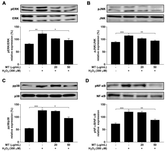 Effects of MT on MAPK (ERK, JNK, and p38) and NF-κB protein expression in SH-SY5Y neuroblastoma cells. Cells were pre-treated with MT for 2 h, followed by treatment with H2O2 for another 24 h. Expression levels of phosphorylated (A–C) MAPK family proteins and (D) NF-κB were evaluated by western blot analysis. Data are presented as mean ± SEM of three independent experiments. * p < 0.05 ** p < 0.01, and *** p < 0.001.