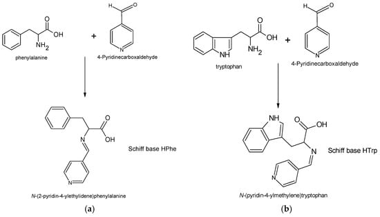 The Schiff bases were synthesized using a previously reported method, with some modification [29,45]. The reaction was performed in an anhydrous methanol solution under an argon blanket in an alkaline medium (0.05 mmol KOH/mL). After dissolving 10 mmol of phenylalanine in 100 mL methanol solution, a stoichiometric amount of 4-pyridine carboxaldehyde was added dropwise with constant stirring; the temperature of the solution was gradually increased to 50 °C, and the solution was stirred for 2 h. After lowering the solution temperature to approximately 30 °C, the process was continued for the next 24 h. The solution was then highly concentrated on an evaporator (evaporation volume approximately 15–20% of the original solution volume) and allowed to crystallize. Yellow fine crystals were obtained, which were washed with methanol and recrystallized again from methanol. The product was obtained with approximately 67% yield.
