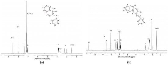 The composition of the synthesized Schiff bases was confirmed by 1 H NMR, FTIR, and elemental analysis. In the 1H NMR spectrum of HPhe (Figure 2a), a lack of signals assigned to the proton of aldehyde group of pyridinecarboxaldehyde (CH–OH at 10.2 ppm) and protons of the -CH2–CH–NH2 group at 3.4 ppm assigned to phenylalanine was observed. Instead of that, new signals appeared: signal 7 of group =N–CH- at 3.9 ppm, and 8 of group =N–CH–CH2- at 3.0 and 3.3 ppm (in the spectrum of unreacted phenylalanine signals, -CH2–CH–NH2 appeared at 2.8 and 3.1 ppm).