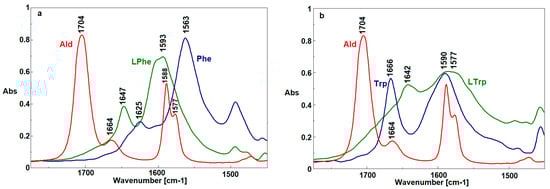 FTIR spectra of HPhe, 2-C-pyridine aldehyde, and phenylenealanine (a), and HTrp, 2-C-pyridine aldehyde and tryptophane (b).