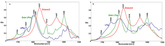 FTIR spectra of Zn[(acac)(LPhe)H2O], Zn[(acac)2 H2O], and HPhe (a), and Zn[(acac)(LTrp) H2O], Zn(acac)2 H2O], and HTrp (b).