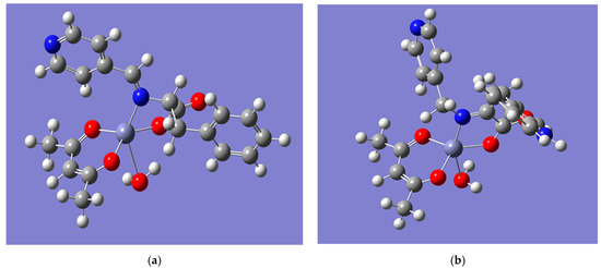 In the present study, the Zn(II) complexes were optimized and analyzed with the Gaussian 03 program using the DFM method, with a basis set in the gas phase. Both complexes showed a similar geometry (Figure 6). Based on the calculations, we consider that the Zn(II) complexes had a distorted trigonal bipyramidal geometry. This type of structure for the Zn(II) complex was first described in 1995 [35].