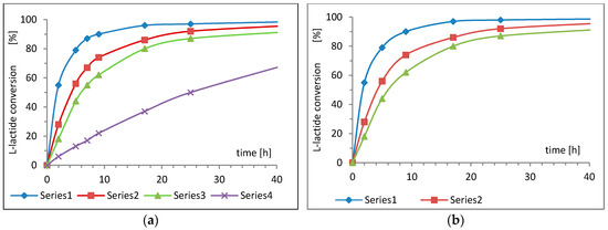 The next step of our study was to determine the efficiency of the synthesized complexes as initiators in ROP of lactide. For this purpose, a few attempts of l-lactide polymerization using both complexes were conducted in bulk at 110 °C, with the initiator-to-monomer (I/M) molar ratios of 1:150, 1:400, and 1:600 (Figure 7). For comparison, an analogous polymerization under the same conditions was conducted using Zn[(acac)2H2O]. Both new complexes, regardless of the concentration, easily dissolved in melted l-lactide and formed a homogeneous phase with the melted monomer, and both of them were found to be effective initiators. However, the Zn[(acac)(LTrp)H2O] complex showed slightly higher activity. In the reaction conditions, by using this initiator, the conversion of the monomer ranged between 80% and 90% within 24 h (Figure 7b). Monomer conversion during the use of the second complex Zn[(LPhe)(acac)H2O] was slightly lower and ranged between 70% to almost 90% in 24 h (Figure 7a). Both complexes were found to be much more active as initiators in the ROP of lactide as compared to the previously described zinc acetylacetonate (Figure 7a, Serie 4), which demonstrated a conversion close to 90%, but only after approximately 70 h [24].