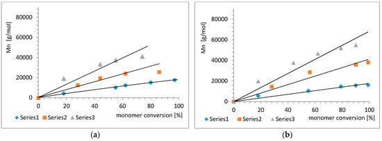 Relationship between the average molecular weight of the polylactide and monomer conversion; polymerization was conducted in bulk at 120 °C, initiated by Zn[(LPhe)(acac)H2O] (a), and Zn[(acac)(LTrp)H2O] (b). Series 1—with an M/I ratio of 150:1; Series 2—with an M/I ratio of 400:1; and Series 3—with an M/I ratio of 600:1.