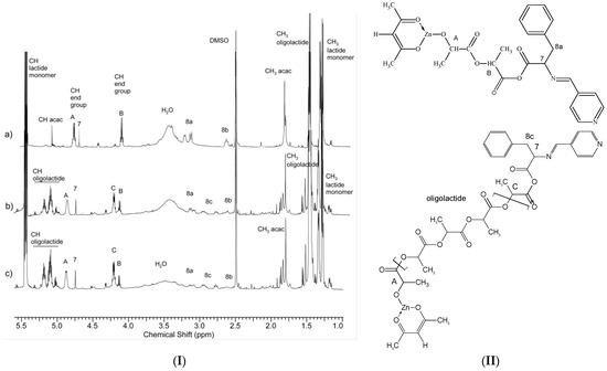 To follow the proceeding changes, lactide polymerization was conducted at a relatively high amount of initiator (molar ratio I/M of 1:12). This model reaction was performed in benzene because this solvent is inert and not influenced by the initiation mechanism (nonpolar solvent without the ability to coordinate to the metal of the central complex). Figure 9 shows the 1H NMR spectra of the obtained reaction products. The analysis of the the spectra showed the continuous presence of the CH3 signal of the acetylacetonate ligand during the polymerization process. Admittedly, as the polymerization progresses, this signal is split more and more, which is associated with the formation of the polymer chain; however, the average intensity of the signals was constant throughout the investigation. There was also a lack of characteristic signals related to the free acetylacetonate groups, Hacac, which should occur for proton transfer and ligand exchange reactions, as was observed during the initiation of the polymerization of Zn[(acac)H2O] [43]. Initially, the signal of the CH group of the acetylacetonate ligand was also visible, but with the progression of reaction time, it was overshadowed by the CH signals of the growing polylactide chain. This observation proves that the acac ligand was coordinated with the central atom of the initiating complex throughout the studied polymerization process. Thus, the observed initiation polymerization mechanism with zinc complexes containing LTrp and LPhen ligands is different from that previously described for Zn[(acac)2 H2O] or Zr(acac)4. In that case, the Schiff base ligands must play an essential role in the monomer insertion process. This assumption might be proved by the observation of Signal 7, which was present throughout the entire reaction time and shifted strongly to 4.72 ppm (it was 4.42 ppm in the initial complex and 3.85 ppm for the Schiff base). Signal 8b—characteristic for the protons of the Schiff base ligand in the initiating complex (see also Figure 4a, Signal 8 at 2.5–2.7 ppm)—disappeared as the polymerization progressed (Figure 9, Signal 8b—occurring in Zn [(acac)(LPhe)H2O]). This signal also appeared in the spectra, initially mainly as Signal 8a shifted to 3.05 and 3.15 ppm and then as a rising signal at 2.77 and 2.95 ppm (Figure 9I, Signal 8a and 8c). The structure of the initiating complex then changed, and most probably, the derivative of the Schiff base was continuously linked to the polylactide growing chain, as illustrated in the enclosed scheme (Figure 9II, a,b). These observations suggest that the mechanism of initiating lactide polymerization with Zn[(acac)(LPhen)] observed in this work is analogous to the previously described mechanism of initiation of polymerization of trimethylene carbonate (TMC) with the complex obtained in the reaction of Zr(acac)4 and benzoic acid. [43]. The ROP initiating complexes described in the current work are similar in some aspects to those discussed in previous work. They were also obtained by an acetylacetonate ligand exchange reaction, in this case with a Schiff base. However, the full confirmation of this hypothetical mechanism requires many additional studies, which is beyond the main scope of this work.