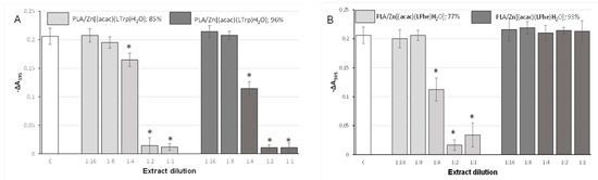 To estimate the degree of the potential toxicity of the obtained polymers, tests of their cytotoxicity against fibroblast lines were carried out. The assessment was performed on crude polylactide samples obtained with both initiators (with an M/I molar ratio of 1:400) and at different monomer conversion rates. Figure 10A shows the viability of CCD-11Lu fibroblasts treated with extracts from polymers obtained with Zn[(acac)(LTrp)H2O] with 85% and 96% lactide conversion, assessed employing the resazurin reduction assay. Cytotoxicity profiles of both materials were similar, regardless of the conversion rate. Undiluted extracts caused almost complete suppression of cellular growth, similarly to the 1:2 dilution. Extracts diluted 1:4 caused only partial inhibition of cell growth, whereas larger dilutions did not significantly affect cellular proliferation. As shown in Figure 10B, polylactide initiated with Zn[(acac)(LPhe)H2O] displayed excellent biocompatibility but only after a lactide conversion rate of 93%. In the case of that material, even the undiluted extract did not cause any decrease in cell viability. Simultaneously, the material characterized by the lower conversion rate had a cytotoxicity profile very similar to the above-described polymers. We do not present results of LDH release assays for polymeric extracts because some extracts apparently inhibited the activity of lactate dehydrogenase, and hence, in this case, it could not be considered as a reliable indicator of cell viability.