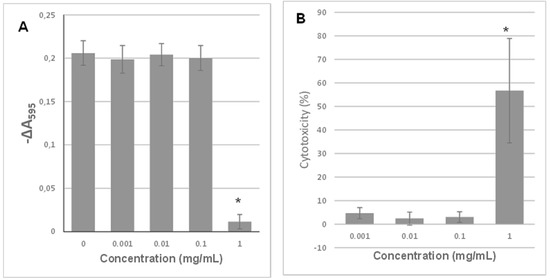 The cytotoxicity of the initiator itself was also assessed. Figure 11 shows the results of cytotoxicity tests of Zn[(acac)(LPhe)H2O]. Both the used techniques, namely, the resazurin reduction and LDH release assays, unanimously proved that the tested compound decreased the cell viability exclusively at a relatively high concentration of 1 mg/mL. This means that in concentrations showing a strong bactericidal effect, this compound displays practically no cytotoxicity. Unfortunately, we were unable to perform an analogous assay for the Zn[(acac)(LTrp)H2O] initiator because of its too poor water solubility (as it formed a suspension, sterilization with the use of a membrane filter was impossible).