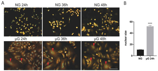 (A) Microgravity exposure of A549 cells is accompanied by the generation of polynucleated cells at 24 and 36 h. Multinucleated cells were observed during the various exposure times at high frequency (10–15% of the total). Scale bar: 100 µm. (B) Histogram showing the nuclear size (mean+/−SEM) in normal gravity (NG) versus 24 µG exposed cells (n = 100 cells, **** p < 0.0001, T Student’s test).