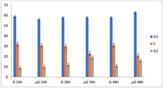 µG significantly affects A549 cells proliferation and their cell cycle. Table 1 reports data associated to cell proliferation and cell cycle for A549 cells maintained in simulated µG and normal gravity (NG) conditions for 24, 36, and 48 h. Exposure of A549 cells to µG leads to a reduction of cell proliferation, associated with a progressive accumulation in the G1 and G2 cell cycle phases. The morphological parameters of A549 maintained in µG are essentially stable in the range between 0 and 48 h. The apoptosis was measured by Trypan blue assay.