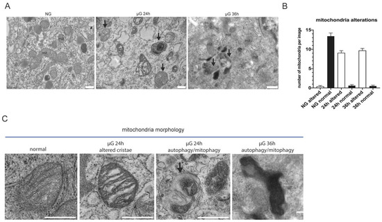 Ultrastructural analysis of mitochondria morphology under µG. Representative micrographs of A549 cells subjected at normal versus µG for 24 and 36 h. (A) Normal gravity mitochondria (mit) display normal cristae and electron-density. Abundant endoplasmic reticulum (ER) cisternae are visible surrounding them. Altered mitochondria (mit) with abnormal cristae and increased electron-density are observed in µG-treated cells. ER cisternae appear dilated. Several autophagic/auto lysosomal vacuoles are evident at both 24 and 36 h (black arrows), and are rarely observed in ground cells. Scale bars: 500 nm. (B) Histogram showing the number of altered mitochondria per micrograph in each experimental condition (mean+/−SEM). (C) High magnification details of mitochondria morphology alterations in µG compared to mitochondria in normal gravity. Note the alterations of cristae, the increased electron-density, and the presence of an autophagic vacuole containing a putative damaged mitochondrion (black arrow). Scale bars: 500 nm.