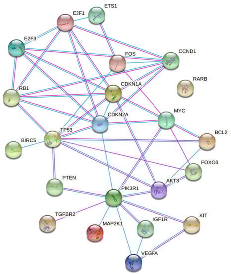 These genes are closely related in central metabolic pathways where the phosphatidylinositol 3-kinase-Akt (PIK3R1-Akt) signaling pathway plays a crucial role [22] PIK3R1-Akt is primarily regulated upstream with their negative regulator PTEN and downstream with several effectors including FOXO3. On another side, these genes are linked with cell cycle control (CDKN2A/1A and RB) and with the transcription factors E2F1/3 and, finally with the control of the mitochondrial activity (BCL2). The control of all these highly interconnected paths appears under the control of TP53. The STRING representation (Figure 4) of these relationships offers a picture of this complex pattern.