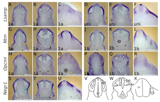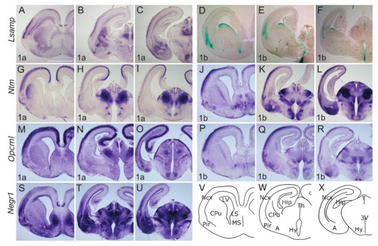 The following are available online at https://www.mdpi.com/article/10.3390/ijms22136955/s1, Figure S1: In situmRNA hybridization displaying Lsamp 1a, Negr1, Ntm 1a, andOpcml 1b at E10.5 coronal sections. Figure S2. Expression from IgLON family alternative promoters at E17 forebrain images at high magnification.