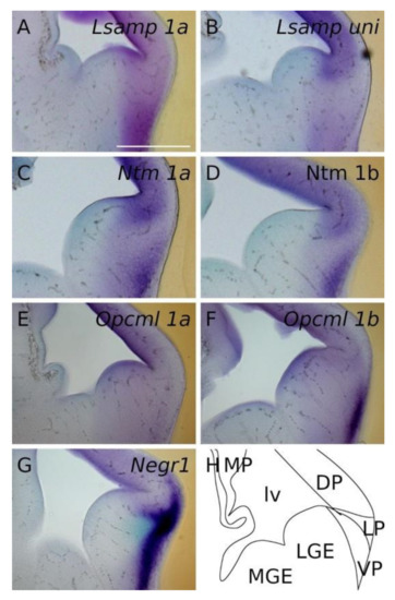 In situ mRNA hybridization displaying IgLON members in developing pallium. (A–G) Expression of IgLON probes recapitulating alternative promoter activity in pallial divisions at E13.5 mouse embryo. (H) scheme of cutting planes. Abbreviations: DP, dorsal pallium; LP, lateral pallium; VP, ventral pallium; MP, medial pallium; lv, lateral ventricle; LGE, lateral ganglionic eminence; MGE, medial ganglionic eminence; Lsampuni, Lsamp 1a + 1b. Scale bar: 500 μm.