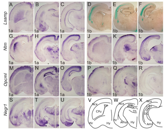 Expression from IgLON alternative promoters at P0 mouse CNS. (A–C; G–U) In situ mRNA hybridization; (D–F) X-gal staining. (A,D,G,J,M,P,S) coronal sections through the level of olfactory tuberculum and septum. (B,E,H,K,N,Q,T) sections pass through the middle part of Amy and diencephalon; (C,F,I,L,O,R,U) through the caudal part of Amy and diencephalon. (A–C) Lsamp 1a is expressed laterally in the upper layer of the cortex and in the ammon horns of the hippocampus. Expression in CPu forms a medio-lateral gradient where the strongest expression is seen medially. Strong expression is seen in Amy. (D–F) Lsamp 1b in the cortex is seen below 1a expression domain and is missing from Amy. (E,F) expression of Lsamp 1b persists around the third ventricle. (G–I) Ntm 1a in cortical layers is broad and forms gradient being strongest at dorso-medial side. Strong expression is seen in Pir. Same pattern is seen with (J,K) Ntm 1b; however, the expression is more restricted to upper layers of cortex. (G,J) in striatum Ntm 1a/1b is seen laterally immediately beneath the developing corpus callosum. Complementary expression of (H,I) Ntm 1a and (K,L) Ntm 1b is revealed in thalamic nuclei and Amy. (M–O) Opcml 1a is broadly expressed in the cortex, being strongest in the hippocampus. (P–R) Opcml 1b is restricted to the dorsolateral surface of the cortex and portion of thalamic nuclei. (S–U) Negr1 is broadly expressed in lateral surface of developing neo- and piriform cortex; (U) Negr1 expression in hippocampus is observable at caudal portion and is (T,U) strong in Amy and upper thalamic nuclei. (V–X) schemes of cutting planes. Abbreviations: Amy, amygdala; CA1, cornuammonis region 1; DG, dentate gyrus; CPu, caudal putamen; LV, lateral ventricle; Ncx, neocortex; Pir, piriform cortex; Th, thalamus; Hy, hypothalamus. Scale bar: 1 mm.
