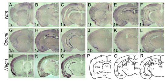 Expression from IgLON alternative promoters in the adult mouse CNS. In situ mRNA hybridization. (A,D,G,J,M) coronal sections through the level of olfactory tuberculum and septum. (B,E,H,K,N) sections through the middle part of Amy and diencephalon region. (C,F,I,L,O) caudal sections illustrate the mammillary hypothalamic region. (A) Ntm 1a expression is seen in Pir and anterior nuclei of thalamusas well as defined layers of sensory and motor cortex. (B,C) Observable Ntm 1a expression pattern is seen in visual and auditory cortex and ecto- and entorhinal cortices. Relatively strong expression is seen in amygdala as well as in specific cells of the hippocampus. (D,E) Similar expression pattern is seen with Ntm 1b probe, where strong expression is defined in the auditory cortex and amygdala. (G,H) Opcml 1a is broadly expressed in the cortex and strongest at upper layers throughout sensory and motor columns. Intense staining is seen in (G) piriform cortex and (H,I) hippocampus. Similarly (J–L) Opcml 1b is restricted to the upper layers of the sensory cortex. Strongest expression is seen in (J) piriform cortex. Faint expression is seen in (K,L) hippocampus. (M,N) Negr1 is broadly expressed in sensory cortical structures, notably in layers of the auditory cortex. Intense expression is seen in (M) piriform- and entorhinal cortex. (N,O) Relatively strong signal is seen in the hippocampus, notably in CA2 and dentate gyrus. Strong expression in amygdala greatly overlaps with other family members. Faint expression is observable in thalamic nuclei. (P–R) schemes of cutting planes. Abbreviations: 3V, third ventricle; Amy, amygdala; Au, auditory cortex; B, barrel cortex; CA1, cornuammonis region 1; CA3, cornuammonis region 3; CPu, caudal putamen; DG, dentate gyrus; Ect, entorhinal cortex; Ent, entorhinal cortex; LV, lateral ventricle; MS, medial septum; Ncx, neocortex; Pir, piriform cortex; Th, thalamus; Hy, hypothalamus. Scale bar: 1 mm.