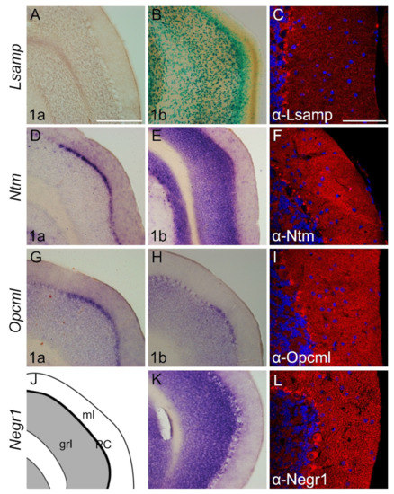 Expression from IgLON alternative promoters and proteins in adult mouse cerebellum. (A,D–E,G,H,K) in situ mRNA hybridization; (B) X-gal staining; (C,F,I,L) immunofluorescence staining. (A–L) Images present the expression in the paraflocculus region of the cerebellum. (A) Lsamp 1a expression is not observable; however (B) Lsamp 1b is highly expressed through molecular and granular cell layers. (D) Ntm 1a expression is restricted to the Purkinje cell layer whereas (E) Ntm 1b is observable in the granular cell layer. As with Ntm 1a (G,H) Opcml 1a/1b is expressed in defined locations of Purkinje cell layers. (K) Negr1 probe is observable in both Purkinje cells and granular cell layers. (J,K)scheme of cutting planes. Abbreviations: grl, granular layer; ml, molecular layer; PC, Purkinje cell layer. Scale bar: 300 μm (A,B,D,E,J,K); 100 μm (C,F,I,L).