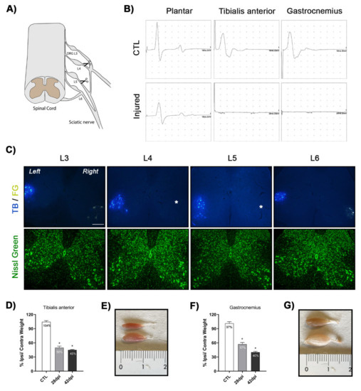 Injured animals presented an altered walking pattern, dragging the lesioned right hindlimb [6]. The denervated muscles suffered severe atrophy. At 28 dpi a significant reduction to 50% and 57% of the TA and GM muscles weight compared to the contralateral uninjured muscles was observed. At 42 dpi muscle atrophy progressed, with 45% (TA) and 40% (GM) weight versus the contralateral muscles (Figure 1D–G).