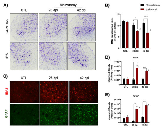 Glial reactivity was assessed by Iba1 and GFAP immunostaining in the ventral horn of lumbar spinal cords. Microglial reactivity was significantly increased in the injured side compared to control mice, being more pronounced at 28 dpi than at 42 dpi (Figure 2C,D). Similarly, a significant increase of astroglia reactivity was observed after rhizotomy similar at 28 and 42 dpi (Figure 2C–E). The contralateral side of the spinal cord did not show significant differences of glial markers in comparison with the intact control group.