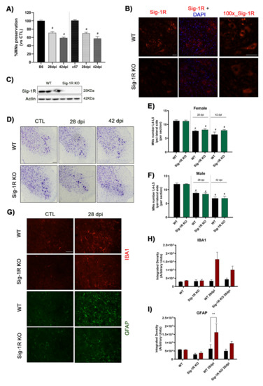 Considering that the administration of Sig-1R ligands modulates MN survival, we investigated the consequences of the absence of this protein using transgenic KO mice with Sig-1R gene deletion. Because Sig-1R KO mice have C57BL6 background, the time course of MN death in WT mice of B6SJL and C57BL6 strains was first compared. Results showed no significant differences in the evolution of MN degeneration after L4–L5 rhizotomy between strains; the percentage of MNs loss after rhizotomy in C57BL6 WT mice was 30% and 40% at 28- and 42 dpi, respectively (Figure 4A).