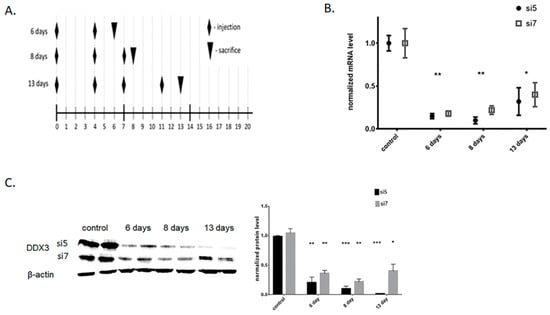 Knockdown of DDX3 in murine liver. (A) Schedule of LNP-siRNA injections in vivo. (B) RT-qPCR quantification of DDX3 mRNA recovery after single LNP-siRNA #5 and #7 IV injection—mRNA levels at days 6, 8 and 13. (C) Western-Blot analysis of DDX3 protein at days 6, 8 and 13 after multiple LNP-siRNA #5 and LNP-siRNA #7 injections according to schedule 1A. * p < 0.05, ** p < 0.01, *** p < 0.001.