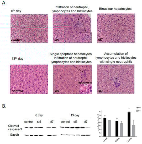 First, we selected potent and efficient siRNA (#5 and #7). They demonstrated similar activity in the cell line (~80% knockdown of DDX3 mRNA and protein; see Supplementary Materials Figure S1B,E), while in vivo we observed a significant difference for siRNA: #5 was more active, while #7 less active (Figure 1C). As the siRNA demonstrated close efficacy at day six and the most pronounced difference at day 13, we chose these timepoints for further morphological analysis and deep RNA sequencing of liver samples in comparison to controls and DDX3 knockdown Hepa1-6 cells in vitro. At day 13 of DDX3 knockdown, H&E staining of the liver revealed infiltrated immune cells after administration of both siRNA #5 and #7 and the appearance of individual dying hepatocytes in the case of siRNA #5 (Figure 2A). The appearance of individual apoptotic hepatocytes after long-term administration of the highly active siRNA #5 confirms the damage to healthy cells. We additionally demonstrated the activation of caspase-3 cleavage after long-term administration of the most effective siRNA#5 in vivo (Figure 2B). All these data correlate with the results demonstrated for RK-33 treatment [].