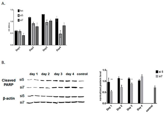 To study the influence of DDX3 protein level on the survival of hepatocytes, we performed MTS assay using Hepa1-6 with DDX3 KD and control cells (Figure 3A). We observed a slight decrease in cell survival after DDX3 mRNA KD during the first three days. Hence, the behavior of the survival curve was similar for siRNA #5 and #7. However, at day four after administration, we observed the decrease in cell survival for siRNA #5, while for siRNA #7, no effects on cell survival were observed. Then, we measured the level of a hallmark of apoptosis, a cleaved form of PARP protein. We found that cleaved PARP was increased in the case of siRNA #5 KD, while in the case of siRNA #7, KD changes were more modest (Figure 3B). Activation of apoptosis in hepatocytes after prolonged siRNA #5 administration can explain the decrease in cell survival. At the same time, a slower increase in cleaved PARP after siRNA #7 administration did not activate cell apoptosis during the first three days of knockdown.