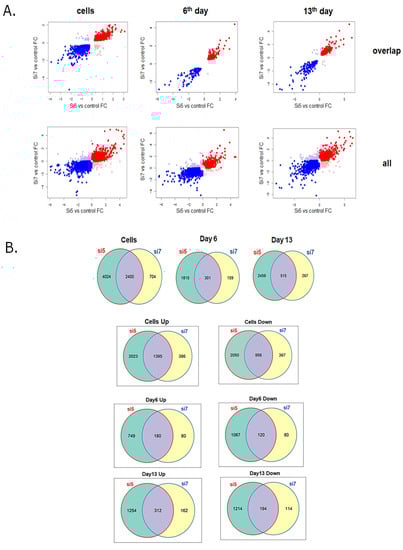 RNA sequencing was used to profile the mRNA expression after RNAi-mediated downregulation of DDX3 RNA helicase in vitro and in vivo. We analyzed changes in mRNA expression at day four after DDX3 knockdown in vitro by more active siRNA #5 and less active siRNA #7. The same approach was used in vivo: we analyzed the transcriptome of the murine liver at days 6 and 13 after DDX3 KD by LNP-siRNA #5 and #7. Comparison of scatterplots of the changes of mRNAs expression levels revealed a huge difference between the phenotypes of DDX3 KD cells obtained with siRNA #5 and #7 in vitro and in vivo because many changes did not overlap (Figure 4A).