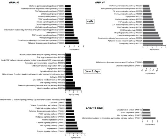 Prolonged siRNA #5 action led to the activation of many cellular signaling pathways at day 13: integrin, Wnt, cadherin, Hedgehog, PDGF, endothelin and glycolysis. Based on these results, the phenotype in vivo after prolonged administration of more active siRNA #5 (13 days) caused the same transcriptome changes of the pathways as both siRNAs in vitro. siRNA #7 was less active in vivo and caused quite different phenotype changes (Figure 5).