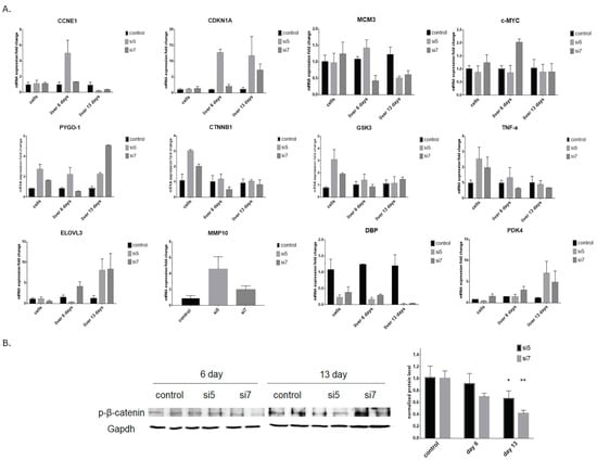 The phenotype after DDX3 knockdown with siRNA #7 in vivo differs a lot from the phenotype in vitro. At day six of DDX3 KD, less active siRNA #7 caused reliable changes only in the biosynthesis of cholesterol and glutamate receptor group pathways. At day 13, we observed changes in Wnt and inflammation signaling pathways mediated by chemokine and cytokine. Administration of more active siRNA #5 led to more significant changes in pathways, including Wnt, integrin, p53 and cell cycle at day six. To evaluate the obtained PANTHER pathways and confirm the transcriptome data, we performed RT-PCR analysis of the genes involved in cell cycle regulation, the Wnt signaling pathway and glucose and lipid metabolism after DDX3 KD in vitro and in vivo (Figure 6A). The observed changes correlate with the data from transcriptome analysis and additionally confirm the results of the PANTHER analysis. For additional investigation of the Wnt signaling pathway in vivo, we checked the phosphorylation level of β-catenin and found a decrease at day 13 in the murine liver after DDX3 KD (Figure 6B). Changes of β-catenin phosphorylation indicate the activation of the Wnt pathway.