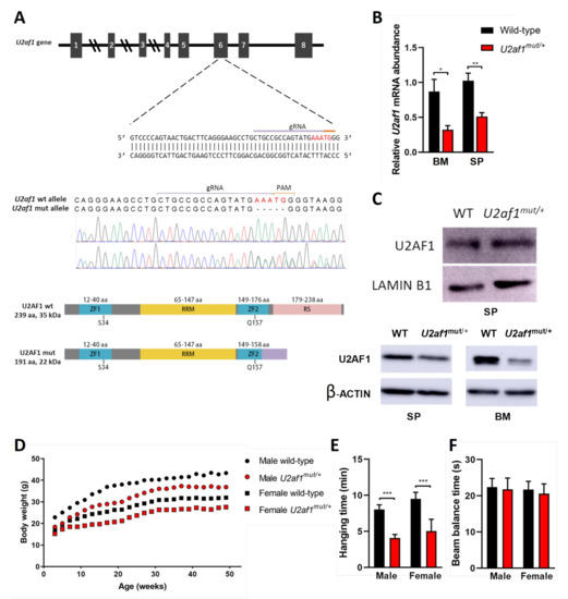 To determine the effect of U2af1 on hematopoietic development, we genetically manipulated the second Zn that affects all the described U2af1 isoforms [30,31] to create a mutant truncated allele at the C-terminus by a CRISPR−Cas9 system (Figure 1A). We first analyzed the 5-nucleotide deletion in the DNA of control WT and heterozygous U2af1mut/+ mice by Sanger sequencing (Figure 1A). At the transcript level, wild-type U2af1 mRNA expression in bone marrow and spleen of heterozygous U2af1mut/+ was decreased in comparison to control WT mice (Figure 1B). At the protein level, no band corresponding to the truncated allele was observed in heterozygous U2af1mut/+ samples. This could be because the mutant transcript is very lowly expressed; alternatively, the translated mature protein could be degraded by the proteasome or might not be detected with our N-terminal antibody due to conformational or stability issues (Figure 1C). When an antibody targeting the RS region was used, a decrease in U2af1 levels was observed in heterozygous U2af1mut/+ samples. Homozygous U2af1 mice, with both alleles edited, reached the blastocyst stage but died afterwards. Heterozygous U2af1mut/+ mice were viable but presented smaller size and developmental abnormalities with delayed reproductive maturity. As shown in Figure 1D,E, size of animals, growth, and muscle strength were affected in heterozygous U2af1mut/+ mice in comparison to WT animals. No differences were found in the equilibrium, as assessed by the beam balance test (Figure 1F).