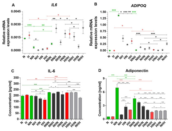 Figure 2. Expression of IL6 (A), ADIPOQ (B), mRNAs and IL-6 (C), and APN (D) proteins in studied human visceral preadipocytes (HPA-vs). Variants differentiated chronically in normoglycemic conditions and chronic hyperglycemia (HG) are colored in green and red (rhombuses or bars), respectively. In Figure 2A,B, variants of transient HG treatment applied during one stage of cell culture are marked by rhombuses with a black upper half and variants exposed to HG during two stages are denoted as rhombuses with a black lower half. In Figure 2C,D, variants of transient HG treatment applied during one stage of cell culture are denoted by black bars and variants exposed to HG during two stages are denoted by grey bars. Data are presented as mean ± SEM. Significant differences are marked by asterisks according to the p-value criteria: *—0.05 ≥ p > 0.01, **—0.01 ≥ p > 0.001, ***—p ≤ 0.001. Significant differences estimated in one-way ANOVA with a post-hoc Tukey test are marked by green or red asterisks.