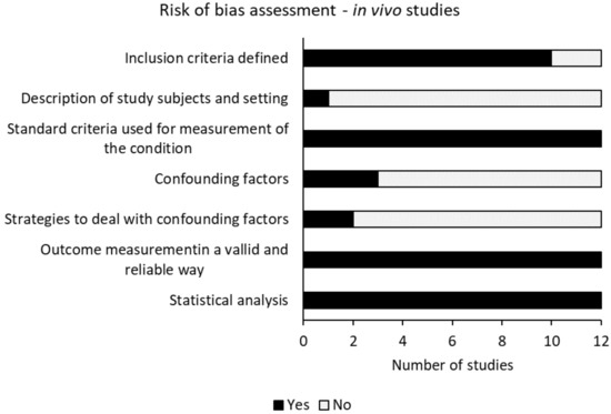 The appraisal of quality and risk of bias was conducted separately of included in vitro and in vivo studies. The risk of bias of in vitro studies was assessed on the basis of the modified guidelines depicted from Samuel et al. [71]. Methodological and reporting qualities were evaluated by nine discrete criteria, respectively. These methodological and reporting criteria are listed in detail in Supplementary Materials Tables S1 and S2. Each individual criterion was rated with yes or no, implying a lower or a higher bias risk, respectively. The risk of bias of relative to in vivo studies was appraised by adapting the Joanna Briggs Institute Critical Appraisal Checklist for analytical cross-sectional study [72]. The quality of studies was assessed by answering seven questions with yes or no, implying a lower or a higher bias risk, respectively. All quality reporting questions are listed in detail in Supplementary Table S3.