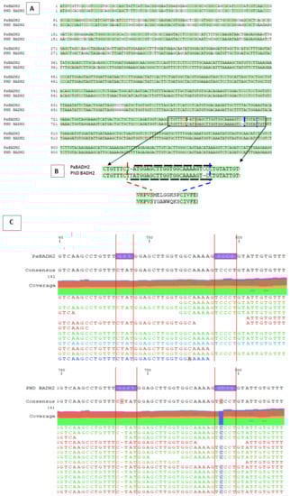 Mapping-based evidence for presence of the PaBaDH2 gene in P. amaryllifolius genotype. PaBADH2 and PND BADH2, Betaine aldehyde dehydrogenase gene of Pandanus amaryllifolius from the present study and Arora et al. (2017), respectively: (A,B) alignment of the PaBADH2 and the PND BADH2 genes showing several mismatches including the insertion of the T nucleotide and the deletion of the C nucleotide at each end of the 24 bp region indicated with red and blue broken vertical lines and the consequential change in the amino acid sequence; (C) mapping of whole-genome Illumina reads of P. amaryllifolius to the PaBADH2 and the PND BADH2 as reference sequences indicates the reads, showing no evidence of the T nucleotide insertion and the deletion of the C nucleotide at each end of the 24 bp sequence.