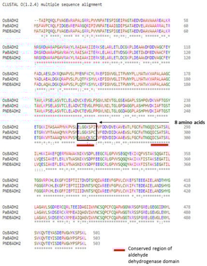 Multiple sequence alignment of BADH2 protein sequence from OsBADH2 (gene ID: 4345606), PND BADH2 (gene ID: KY765936.1), and PaBADH2. The marked region shows the continuous stretch of eight amino acid variations in PND BADH2, as compared with OsBADH2 and PaBADH2 sequences. The conserved region of the aldehyde dehydrogenase domain is represented with red lines.
