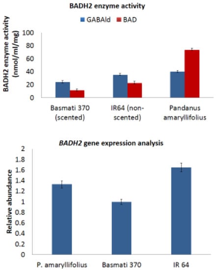A comparative BADH2 enzyme activity using BAD and GAB-ald substrates and gene expression analysis in P. amaryllifolius and rice varieties. The EF1 gene was taken as a reference gene for normalization and relative abundance (fold change) was calculated by the 2−ΔΔCt method.