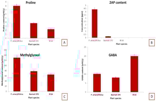 The highest amount of 2AP was recorded in P. amaryllifolius (4.38 ppm), followed by Basmati 370 (0.20 ppm) and the absence of 2AP in IR 64 (Figure 6). The amount of 2AP in P. amaryllifolius was 20–22 times higher than that in the basmati rice varieties. Thus, P. amaryllifolius produces significantly higher concentrations of 2AP than fragrant rice. These results are in agreement with earlier reports []. Among the metabolites studied, free proline (8.01 μmoles/g) and methylglyoxal (130 ± 0.020 μM/g) contents were highest in P. amaryllifolius. Yadav et al. [] reported 62.3 and 74.8 μM/g of methylglyoxal in rice varieties IR 64 and PB1. This indicates that P. amaryllifolius contains an appreciably higher amount of methylglyoxal, as compared to nonscented rice varieties. Moreover, the same trend was followed by GABA content (10.1 µg/g). The concentration of GABA in various plant parts commonly ranges from 0.03 to 5.5 µg/g []. Rashmi and Nadaf [] reported 15.0 µmoles/g GABA in P. odorifer plants. The amount of GABA present in P. amaryllifolius was also considerably higher than in other plants.