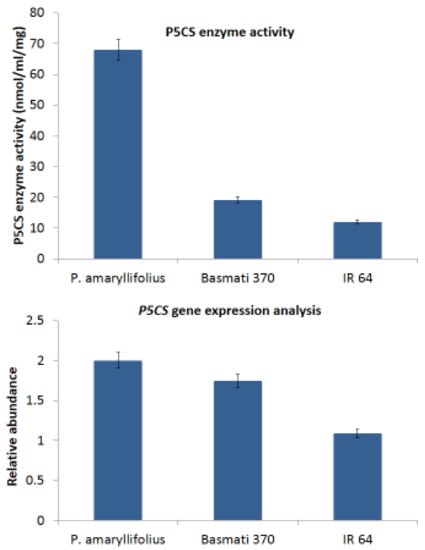 A comparative P5CS enzyme activity and gene expression analysis in P. amaryllifolius and rice varieties was carried out. The EF1 gene was taken as a reference gene for normalization and relative abundance was calculated by the 2−ΔΔCt method.