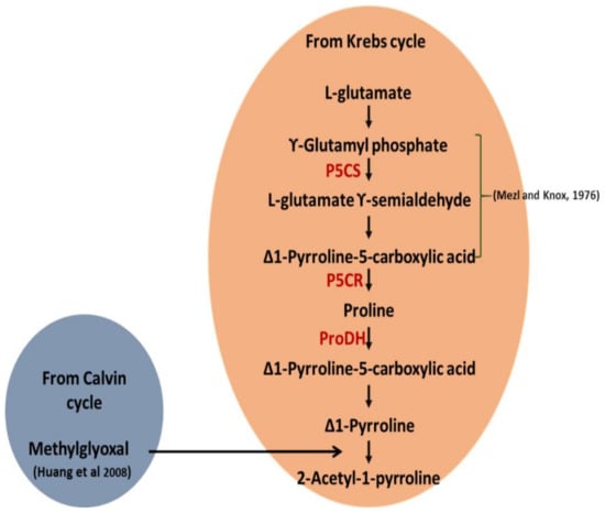In addition to proline, methylglyoxal has also been identified as another precursor for the biosynthesis of 2AP. Wu et al. [] reported higher (1.9 μmol/g) MG levels in aromatic than nonaromatic cultivars (1.2 μmol/g) of soybean. MG was identified as the carbon source for 2AP. Vegetable soybeans with higher levels of 2AP were reported to contain higher amounts of MG demonstrating a direct relation between MG and 2AP. They also demonstrated that an intermediate compound derived from proline reacts nonenzymatically with MG to produce 2AP.