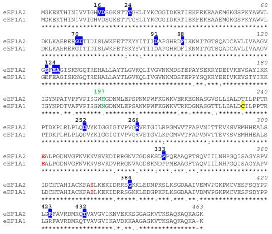 Sequence alignment of human eEF1A1 (EF11_HUMAN) and human eEF1A2 (EF12_HUMAN), which is 100% identical to rabbit eEF1A2 (mouse and rat eEF1A2 proteins only differ in one amino acid: Ser/Asn331Ala). The protein sequences were obtained from UniProtKB [54] and the alignment was produced with Clustal Omega [55]. Asterisks, colons and dots designate identical residues, conserved substitutions and semiconserved substitutions in the aligned sequences, respectively. The two Glu residues identical to those undergoing EFG modification in rabbit eEF1A2 (Glu301/Glu374) are colored in red. Cys234 in eEF1A1, which is essential for oligomerization) [56], is highlighted in yellow. Amino acids that are replaced upon missense mutations in the human EEF1A2 gene and have been associated with severe neurological disorders are boxed and numbered. The amino acid at position 197 is colored in green.