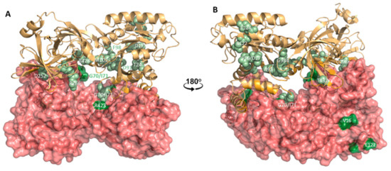 Cartoon representation of the crystallographic eEF1A2 dimer present in the asymmetric cell unit [59], with each monomer in a different color and one monomer enveloped in a van der Waals surface. Views in (A,B) are related by a 180° rotation about the Y-axis. The amino acids enumerated in Table 2 because of their known involvement in genetic disorders are colored in green and labeled in one-character notation. Note that the majority of these amino acids cluster at the dimerization interface and also between domains I and III of each monomer.