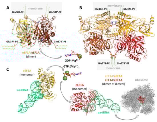 Scheme depicting theoretical 3D models of (A) a full-length post-translational modified eEF1A2 dimer with the PE chains attached to Glu301 of both monomers inserted into a simplified representation of a cellular membrane; (B) a dimer of dimers, as present in the X-ray crystal structure [59], showing the opposite orientation of the PE chains attached to Glu374 in the alternative pairs of dimers and their putative insertion at membrane contact sites; and (C) two eEF1A2:aa-tRNA complexes on their way to the ribosome (PDB entry 5LZS [57]). Note that the perpendicular orientation of PE molecules attached to Glu301 and Glu374 shown in (A) is rather arbitrary because of the rotational freedom of the phosphoglycerol moieties. The GDP and GTP nucleotides in the middle of the figure are displayed as sticks and the bound Mg2+ ions are shown as green spheres.