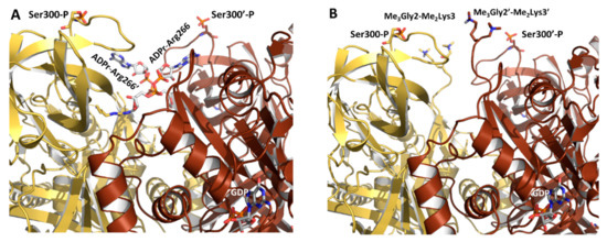 Theoretical models of (A) ADP-ribosylation on Arg266 and (B) N-terminal methylation on Gly2 and Lys3 of both monomers making up the eEF1A2 dimer, as present in the X-ray crystal structure [59]. Note the spatial proximity of both residues to Ser300 and Glu301, which also undergo other PTMs. The view is identical to that shown in Figure 3A. Ser300 is shown in a phosphorylated form (sticks) for reference purposes only.